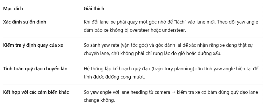 Nếu bạn muốn, mình có thể gửi luôn công thức tính quỹ đạo lane change dựa trên yaw angle, steering angle và vehicle speed. 🚗📐