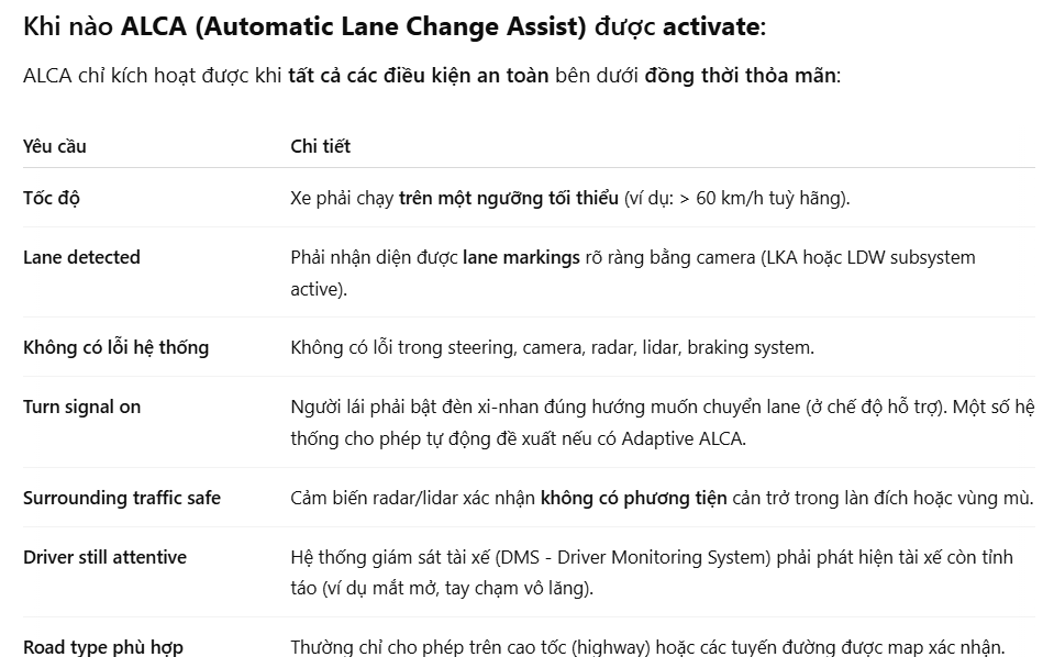 ALCA thường không cho phép chuyển lane nếu xe đang bị đánh lái gắt, phanh gấp, hoặc thời tiết xấu (camera không đọc được lane).