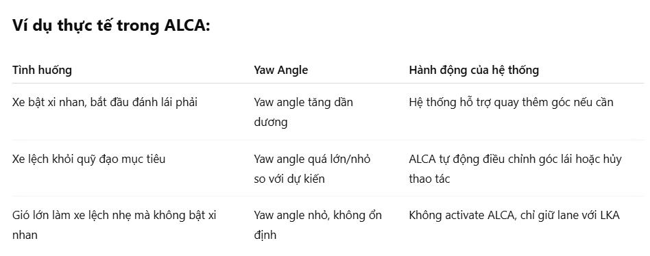 Rất hay — bạn hỏi yaw angle chứng tỏ bạn đang quan tâm sâu đến trạng thái động học (vehicle dynamics) liên quan đến ALCA. Mình trả lời chi tiết luôn: