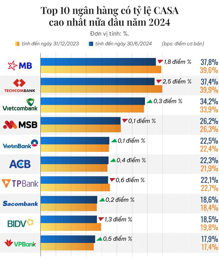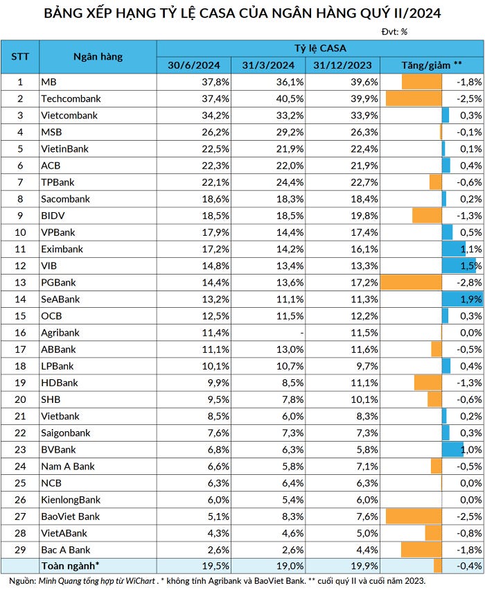 Mặc dù vậy, Techcombank lại không phải là ngân hàng có tỷ lệ CASA cao nhất hiện nay. Theo dữ liệu khách quan từ Wichart, tính đến cuối 2024, MB mới là quán quân về CASA của toàn ngành trong khi Techcombank xếp vị trí thứ hai, tiếp đó là "ông lớn" Vietcombank.
