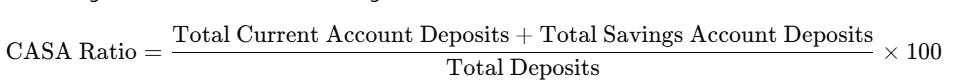 CASA Ratio=Total Current Account Deposits+Total Savings Account DepositsTotal Deposits×100\text{CASA Ratio} = \frac{\text{Total Current Account Deposits} + \text{Total Savings Account Deposits}}{\text{Total Deposits}} \times 100CASA Ratio=Total DepositsTotal Current Account Deposits+Total Savings Account Deposits×100