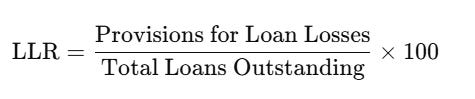 LLR=Provisions for Loan LossesTotal Loans Outstanding×100\text{LLR} = \frac{\text{Provisions for Loan Losses}}{\text{Total Loans Outstanding}} \times 100LLR=Total Loans OutstandingProvisions for Loan Losses×100