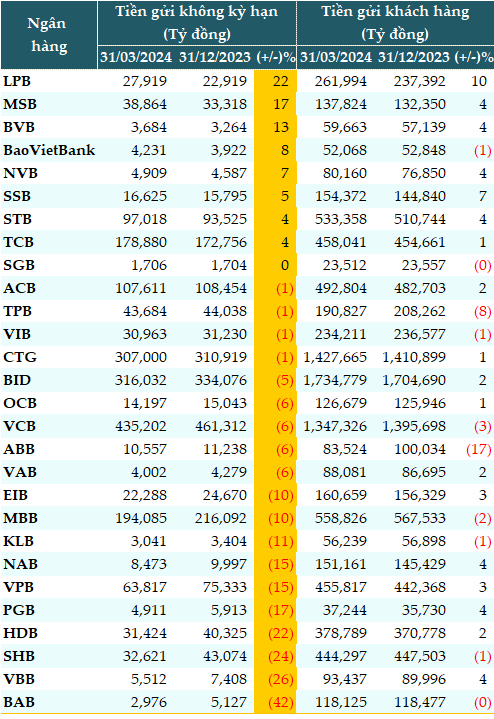 Ở chiều ngược lại, các ngân hàng ghi nhận CASA tăng trưởng như LPB (+22%), MSB (+17%), BVB (+13%)...