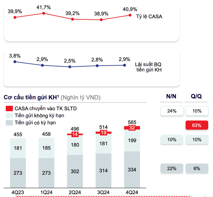 Tại Techcombank, tiền gửi khách hàng trong quý đầu năm đạt 458,041 tỷ đồng. Trong đó, CASA đạt 178,880 tỷ đồng, tăng 2% so với đầu năm. Số liệu từ TCB công bố: tỷ lệ CASA tăng lên mức 40.5%. Động lực tăng trưởng CASA được củng cố thông qua những định vị giá trị độc đáo được ra mắt trong quý như tính năng “Sinh lời tự động” và nền tảng khách hàng thân thiết Techcombank Rewards.