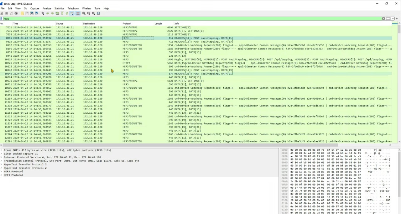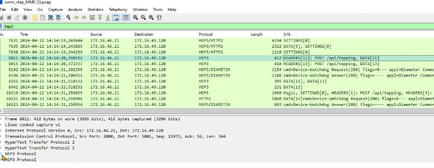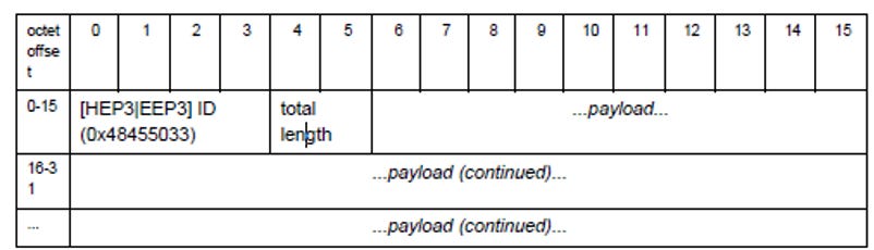 HEP3 (Homer Encapsulation Protocol Version 3) transmits packets over UDP/TCP/SCTP connections. Each packet starts with the HEP3 header: