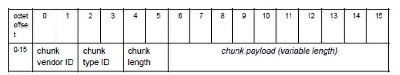 network byte order). The vendor ID allows for grouping of chunk types for specific vendors (i.e., a vendor can receive a vendor ID and then define chunk type on its own). The chunk length field (network byte order) specifies the total length of the chunk, including the vendor ID, type ID, length and payload fields. In combination, the vendor and type ID fields and the length field allows a HEP3 implementation to skip unknown chunks and continue processing of a HEP3 packet.