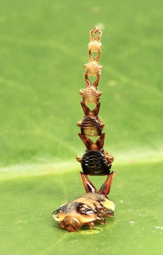 Riêng loài này, chúng không chất phân lên lưng, mà sẽ tích lũy những cái vỏ lột xác cũ (gọi là Exuviae - mình để tên khoa học ở đây cho các bạn tiện tham khảo). Bằng một cách thần kỳ nào đó mà những đôi bàn tay không hề được đào tạo qua các trường lớp mỹ thuật hay kiến trúc nhưng lại có thể tạo ra những tác phẩm nghệ thuật đầy tinh tế đến như vậy.