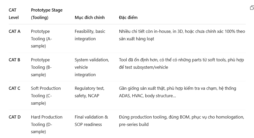 CAT D: yêu cầu hard tooling, chính là các công cụ sẽ được dùng trong SOP (Start of Production). Xe dùng trong validation cuối, homologation, hoặc dùng cho media/show.
