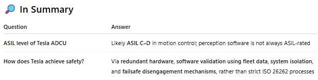 Critics argue its FSD doesn’t align with ASIL-D-level rigor, especially in AI-based perception and decision-making.