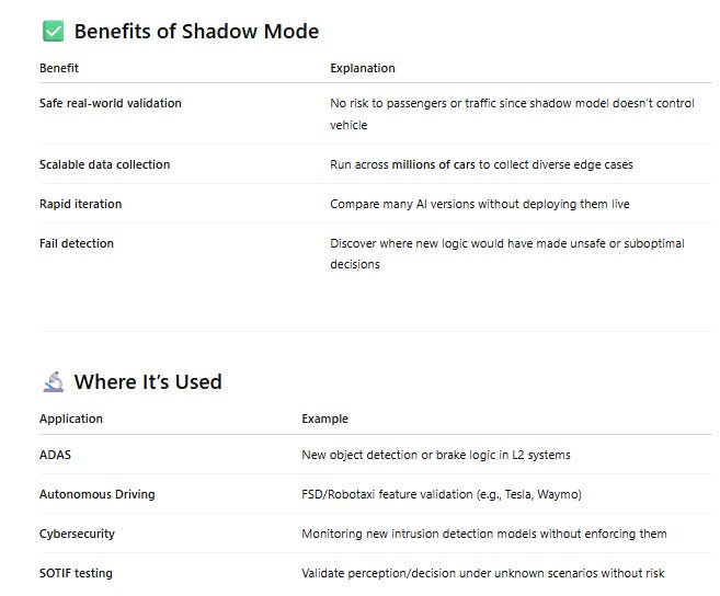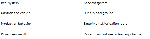 In shadow mode, a new or experimental function (e.g., lane keeping, object detection, decision-making) runs in parallel with the production system — but its outputs are not used to control the vehicle.