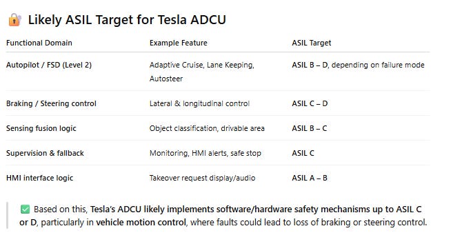 Tesla doesn’t publicly disclose the full ASIL (Automotive Safety Integrity Level) rating of its ADCU (Automated Driving Control Unit), but we can infer key points based on: