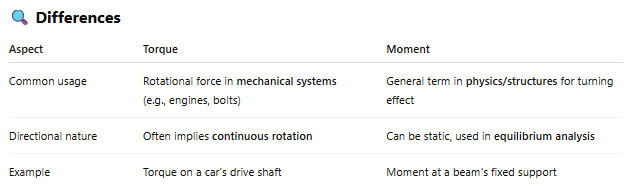 Moment and torque are very closely related — in fact, in many engineering contexts, they are used interchangeably — but there are subtle distinctions depending on usage: