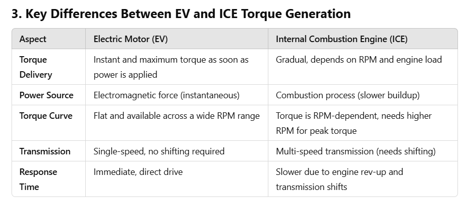 ICE vehicles cannot produce instant torque due to the time required for combustion, and the engine’s torque depends on its RPM. As a result, ICE vehicles need to accelerate and reach higher RPMs before they can produce enough torque, which is a slower process compared to EVs.